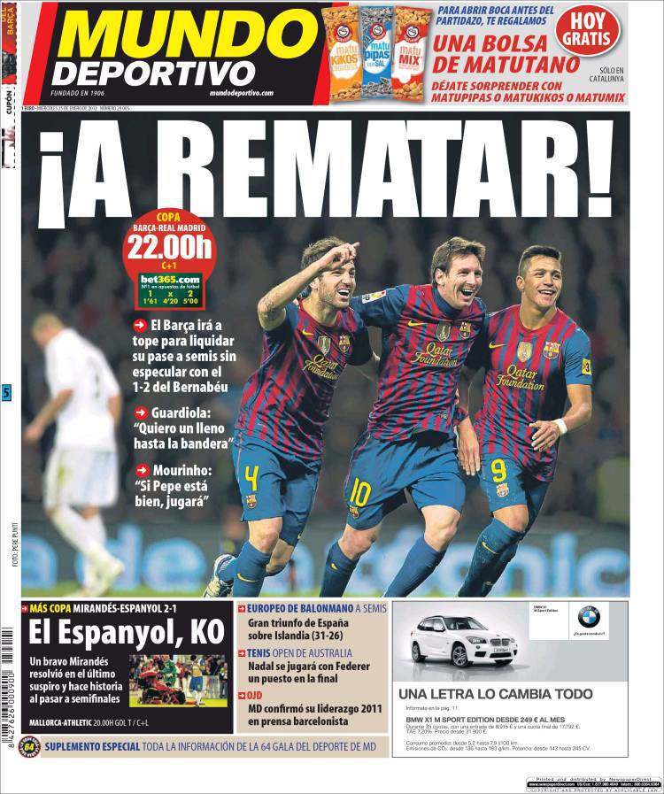 MUNDO DEPORTIVO BARCELLONA – Il quotidiano Mundo Deportivo spinge il Barcellona verso la qualificazione alle semifinali di Coppa del Re. Questa sera ritorno dei quarti contro il Real Madrid, all’andata due a uno per i catalani.