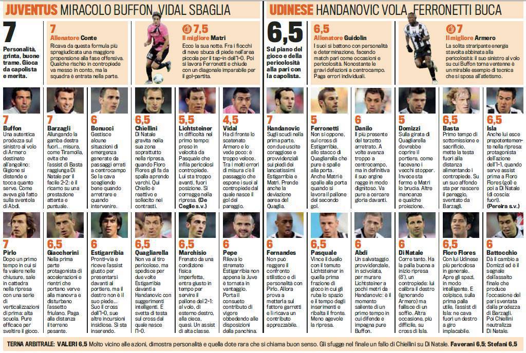 JUVENTUS UDINESE VOTI PAGELLE GAZZETTA DELLO SPORT – Prova maiuscola della Juventus ieri sera contro l’Udinese, in quella che è stata definita da Antonio Conte la partita da 6 punti. In una tempesta di neve abbattutasi su Torino, Alessandro Matri è riuscito con una gran doppietta a regalare la vittoria al suo team, dopo che Antonio Floro Flores aveva pareggiato le marcature. Continua dunque la corsa in solitaria dei bianconeri che detengono ancora la prima posizione del campionato. Leggiamo adesso i voti e le pagelle della Gazzetta dello Sport:
