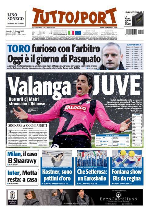 TUTTOSPORT VALANGA JUVE – La neve caduta incessante nella giornata di ieri a Torino, non è riuscita a fermare la corsa della Juventus che nell’anticipo di ieri sera ha battuto l’Udinese per 2 reti ad uno. Tuttosport apre con una bella foto dedicata al protagonista della serata, Alessandro Matri, match winner della partita.