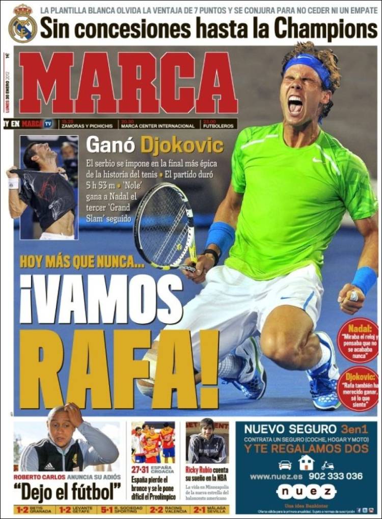 MARCA NADAL – Il quotidiano spagnolo Marca rende omaggio a Nadal che ieri ha perso la finale degli Australian Open con Djokovic.