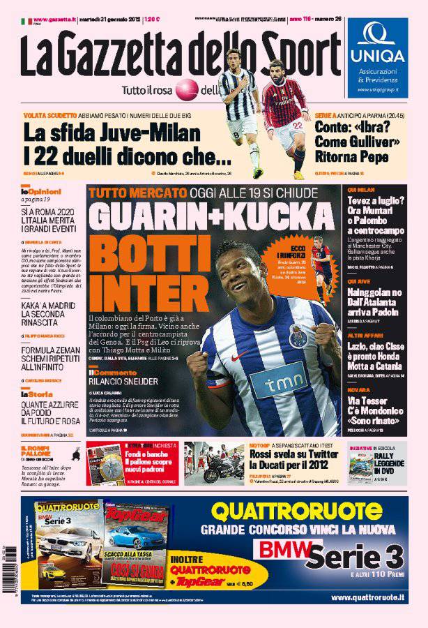 GAZZETTA GUARIN KUCKA – Sulla Gazzetta dello Sport si parla del mercato Inter che ha messo a segno il colpaccio Guarin ed è vicino a Kucka.