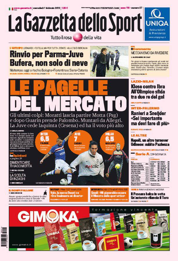 GAZZETTA MERCATO PAGELLE – Sulla Gazzetta dello Sport si parla delle pagelle del mercato delle tre grandi squadre.