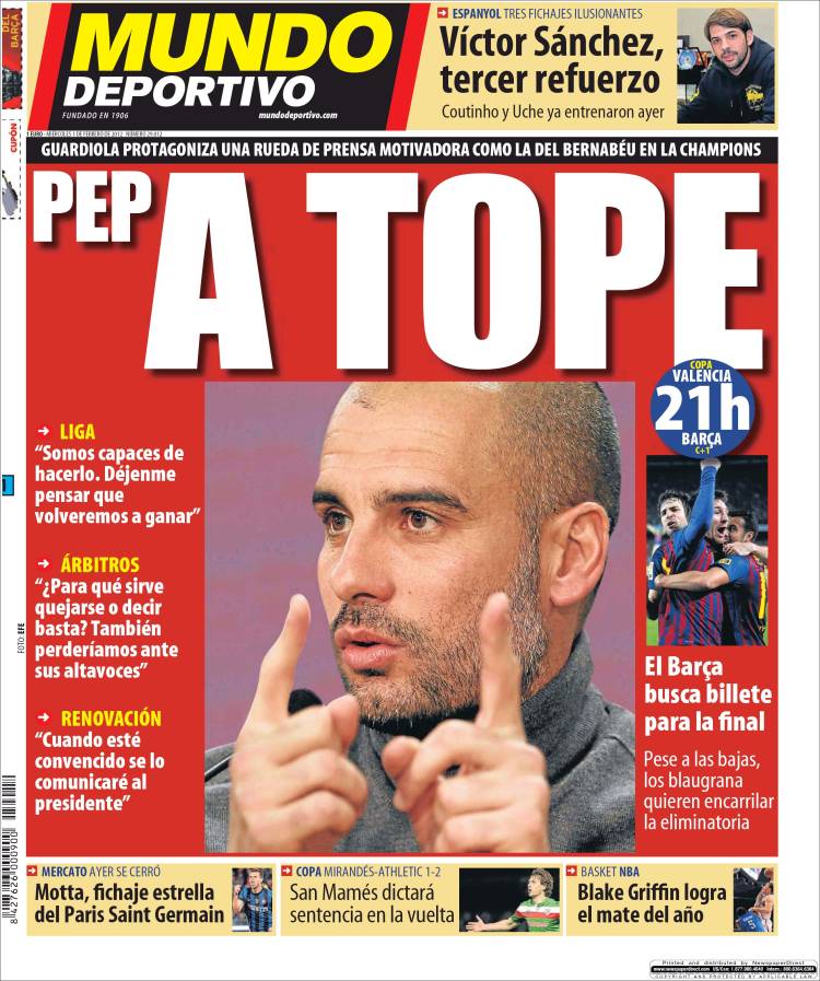 MUNDO DEPORTIVO GUARDIOLA – Il tecnico del Barcellona prepara la squadra per le semifinali di Coppa del Re contro il Valencia ma pensa anche alla rimonta nella Liga.