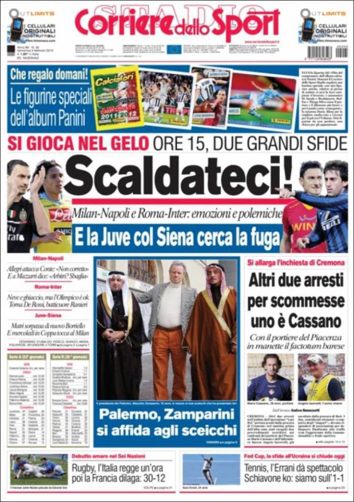 CORRIERE DELLO SPORT SCALDATECI – In un’Italia paralizzata dal freddo, oggi la Serie A farà capolino alle ore 15. Una giornata che ha sapore d’antico, data la contemporaneità di 8 match. Ai giocatori della massima competizione italiana, il compito di riscaldare i tifosi con buone prestazioni, come ricorda il Corriere dello Sport.