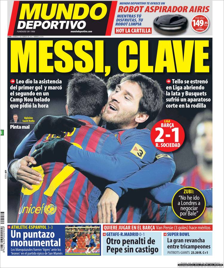 MUNDO DEPORTIVO MESSI – Nella serata che fa notare ancora una volta i problemi della squadra di Pep Guardiola, un giocatore di assoluto talento dimostra di essere la vera luce di questo Barcellona: Leo Messi, con il suo gol ha risolto la pratica Real Sociedad. A lui è dedicata la prima pagina del Mundo Deportivo.