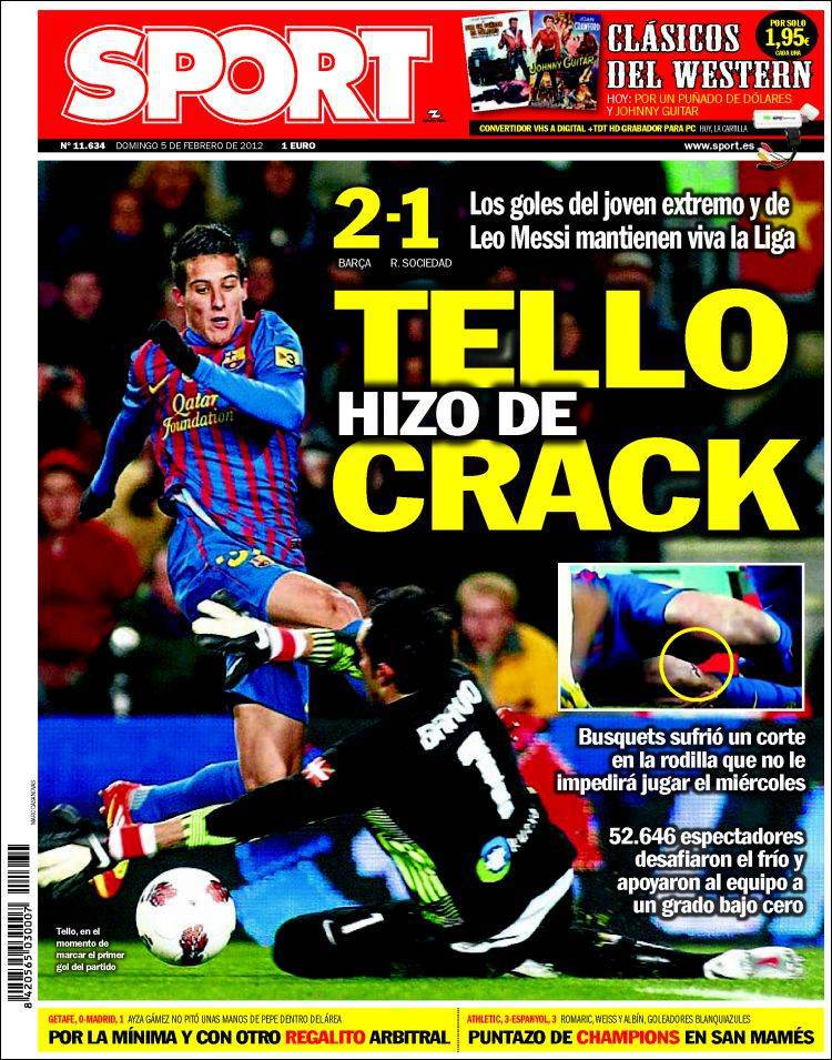 SPORT TELLO – Nella serata che verrà ricordata per il grave infortunio di Sergio Busquets, spunta nel Barcellona un altro giovane che ha deciso la partita con la Real Sociedad, Tello, giocatore celebrato anche dal quotidiano Sport.