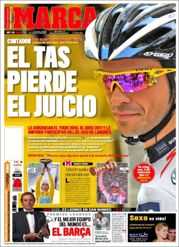 MARCA CONTADOR – Indignazione in Spagna per la squalifica inflitta a Contador, corridore spagnolo, accusato di doping. Salterà le Olimpiadi.