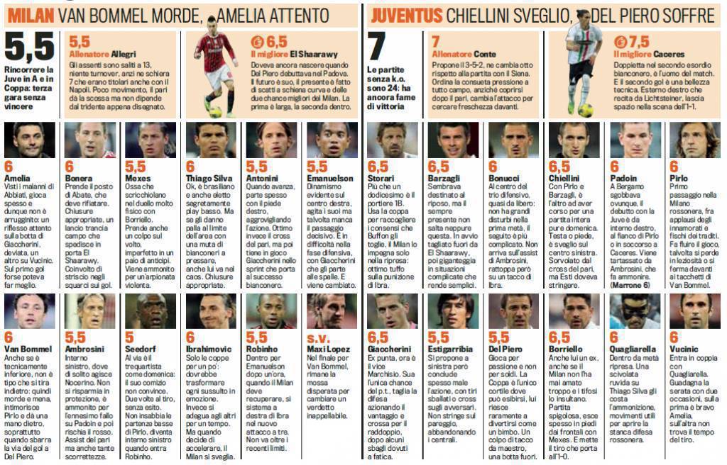 MILAN JUVENTUS VOTI PAGELLE GAZZETTA FOTO – La Juventus vince due a uno al Meazza contro il Milan nella semifinale d’andata di Coppa Italia. I bianconeri vincono grazie alla doppietta di Martin Caceres, difensore uruguagio prelevato a gennaio dal Siviglia. Una doppietta importante con il secondo gol che è un autentico gioiello. Nel Milan invece Ibrahimovic non regala lampi, lo svedese riesce a segnare ma stoppando la palla con un braccio. Ecco i voti e le pagelle della Gazzetta dello Sport.