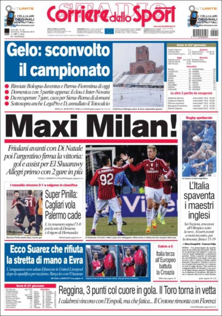 CORRIERE DELLO SPORT MAXI MILAN – Grazie all’attaccante Argentino ex Catania, il Milan può rialzare la testa nella lotta scudetto: Maxi Lopez, ha ieri sera avviato la rimonta del Milan nella partita di Udine ed si è conquistato le prime pagine dei giornali. Il Corriere dello Sport parla infatti di un Maxi Milan.