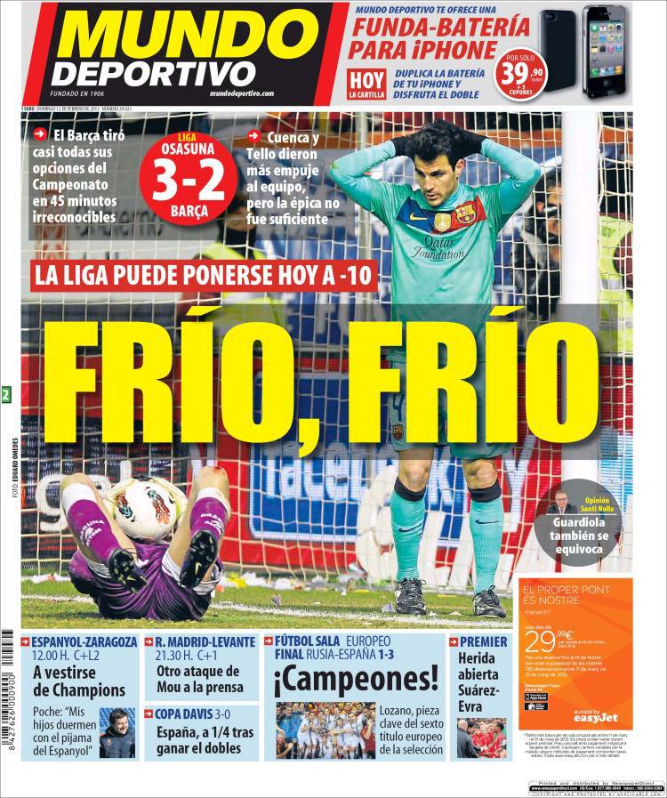 MUNDO DEPORTIVO – Sconfitta a sorpresa quella del Barça che ieri sera è stato sconfitto dall’Osasuna per 3 reti a 2. Adesso le distanze tra i Catalani ed il Real Madrid, potrebbero diventare abissali: 10 punti potrebbero essere davvero troppi…