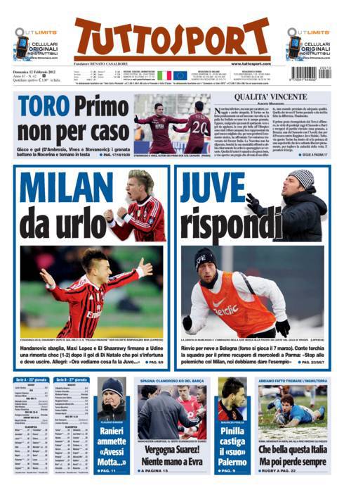 TUTTOSPORT MILAN JUVE – Mentre il Milan è sceso in campo nella giornata di ieri, vincendo con merito ad Udine, la Juve quest’oggi resterà ad allenarsi a Vinovo, dato il rinvio della partita con il Bologna. Tuttosport dunque apre questa lotta scudetto: la Juve riuscirà mercoledì a rispondere con una buona prova sul campo di Parma?
