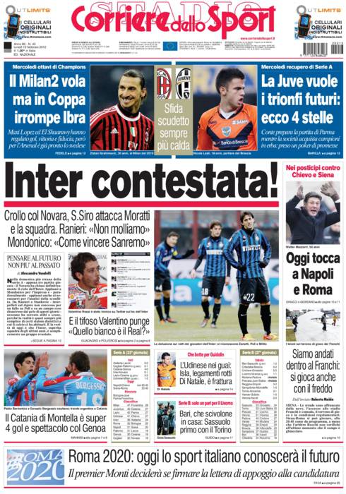 CORRIERE INTER – Sul Corriere dello Sport si parla dell’Inter che ieri è stata contestata dai tifosi dopo la sconfitta contro il Novara.