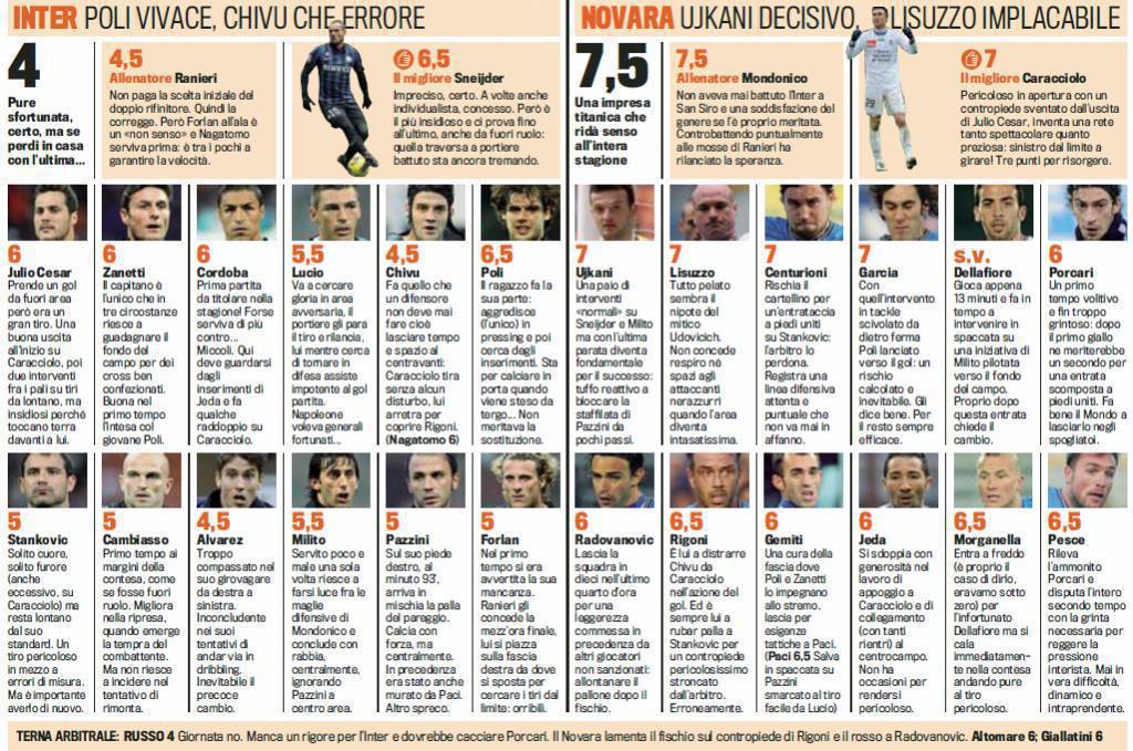 INTER NOVARA VOTI PAGELLE GAZZETTA – Nel post partita l’attaccante del Novara Andrea Caracciolo ha dichiarato: “Fossi in Moratti mi comprerei”. Ha scherzato così l’Airone che ieri pomeriggio ha affossato l’Inter con un sinistro a giro magnifico. Settimo gol in carriera all’Inter per il centravanti del Novara. La matricola guidata da Mondonico trova tre punti importanti contro la formazione di Ranieri sempre più in crisi e contestata dai tifosi. Nell’Inter si salvano solo Sneijder e Poli, malissimo Alvarez e Chivu. Voti e pagelle della Gazzetta dello Sport.