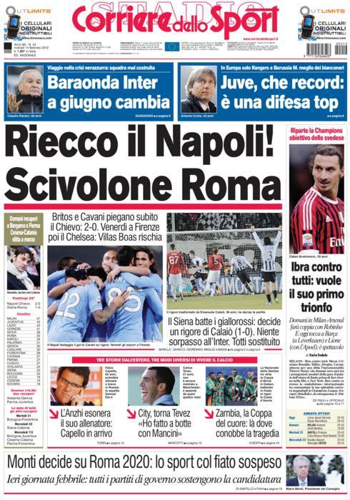 CORRIERE DELLO SPORT NAPOLI ROMA – Si è conclusa ieri la 23^ giornata di Serie A con i posticipi Napoli-Chievo e Siena-Roma. Come riporta il Corriere dello Sport, gli azzurri sono tornati a vincere in casa. Stop invece per la Roma che viene fermato dal Siena sul risultato di 1-0.