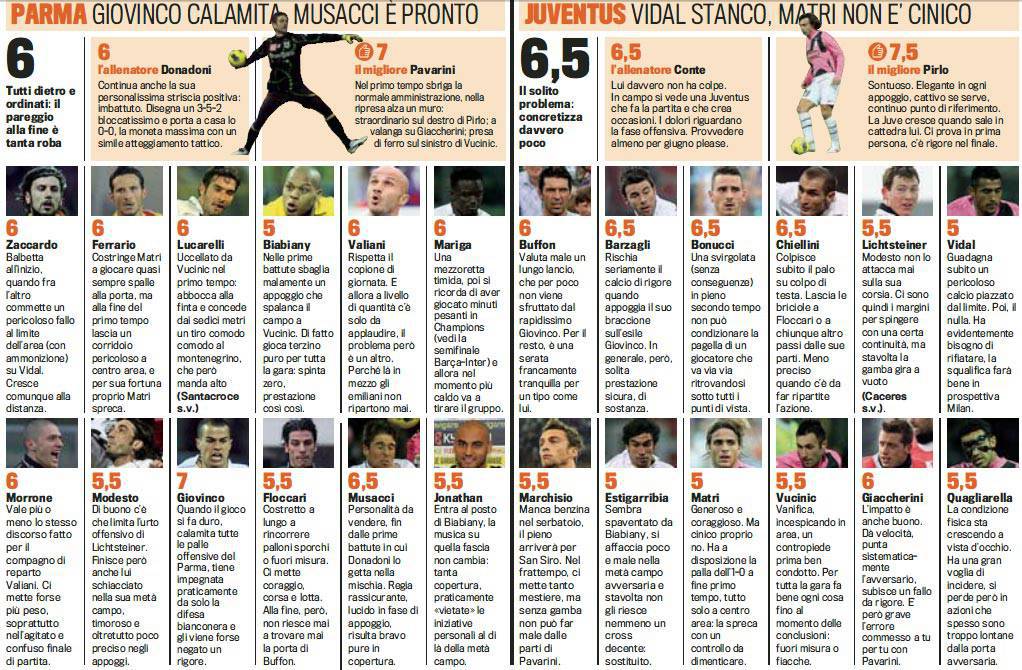 PARMA JUVENTUS VOTI PAGELLE GAZZETTA FOTO – La Juventus pareggia zero a zero a Parma nel recupero della seconda giornata di ritorno. I bianconero reclamano per due rigori non concessi, a fine partita il tecnico Conte è furioso. Ma la Juventus non riesce a concretizzare la grande mole di gioco, Matri e Vucinic sono inconcludenti, il primo ha l’occasione per il gol del vantaggio e la spreca, il secondo continua a dimostrare di non essere un attaccante freddo in area di rigore. Voti e pagelle della Gazzetta dello Sport.