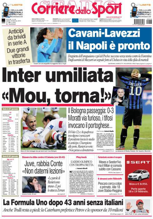 CORRIERE MOURINHO INTER – Sul Corriere dello Sport si parla dell’Inter che perde in casa contro il Bologna e per i cori dei tifosi per Mourinho.