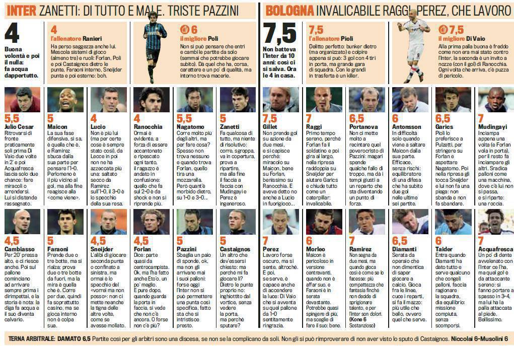 INTER BOLOGNA VOTI PAGELLE GAZZETTA FOTO – L’Inter perde la faccia a San Siro. Il Bologna espugna il campo nerazzurro vincendo tre a zero umiliando i ragazzi di Ranieri sempre più allo sbando. Male, malissimo i nerazzurri in difesa, con Ranocchia imbambolato e Lucio ormai sul viale del tramonto. Neanche i senatori Cambiasso e Zanetti sono quelli di una volta e annaspano anche loro. Nel Bologna è Marco Di Vaio show che approfitta di due regali della difesa dell’Inter. Voti e pagelle della Gazzetta dello Sport.