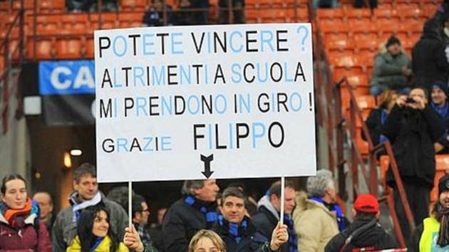 JUVENTUS INTER MILAN FILIPPO TIFOSI – Il piccolo Filippo, giovanissimo tifoso nerazzurro ha manifestato con uno splendido e ironico striscione (vedi Foto sopra) tutto il suo disappunto sul momento dei nerazzurri. Non è tardato ad arrivare un premio per Filippo che ha avuto in suo onore una giornata alla Pinetina con i suoi campioni ma sono arrivate anche le risposte ironiche dei tifosi delle due avversarie di sempre della squadra nerazzurra: il Milan e la Juventus. Allo Juventus Stadium nella serata di ieri un tifoso ha scritto “Filippo o cambi scuola o cambi squadra”. Mentre a Cesena è comparso un altro striscione in cui si legge: “Milan, continua a vincere così prendo in giro Filippo a scuola.”. La genialità non è mancata al piccolo Filippo ma anche ai tifosi di Milan e Juventus.