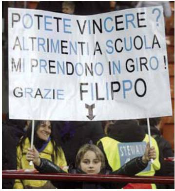 SERIE A INTER – A pochi interesserà la sua storia, ma di certo ha colpito Massimo Moratti, che ha fatto in modo di organizzare un appuntamento alla Pinetina con il bambino e i suoi genitori. Protagonista Filippo, 9 anni, tifoso nerazzurro che evnerdì si è presentato a ‘San Siro’ con unos triscione innocente che recitava: “Potete vincere? Altrimenti a scuola mi prendono in giro! Grazie”. Un messaggio che ha subito messo in moto la dirigenza meneghina, pronta a scovare il bambino e invitarlo all’allenamento: riceverà la maglia da uno dei suoi idoli Javier Zanetti e verrà intervistato da Inter Channel per sapere qualcosa di più. Magari Ranieri potrà ricevere qualche consiglio: in questo periodo sono ben accetti da chiunque…