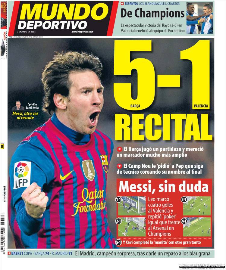 MUNDO DEPORTIVO BARCELLONA – Sul quotidiano catalano Mundo Deportivo si parla del cinque a uno rifilato dal Barcellona al Valencia.