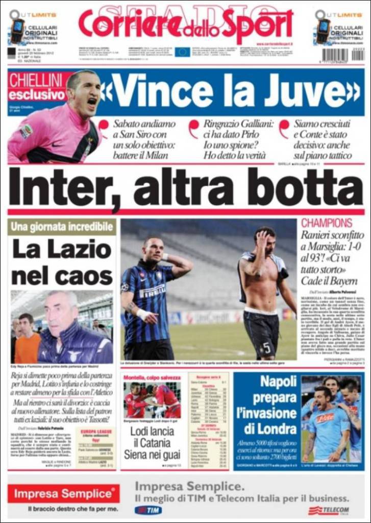 RASSEGNA STAMPA CORRIERE DELLO SPORT INTER – E’ emblematico il titolo del Corriere dello Sport dedicato all’Inter, beffato al 93′ dal Marsiglia nella gara di andata degi ottavi di finale di Champion’s League. Neanche l’Europa che conta è riuscita a risolvere la crisi in cui sono caduti i nerazzurri e che ormai sembra senza via d’uscita.