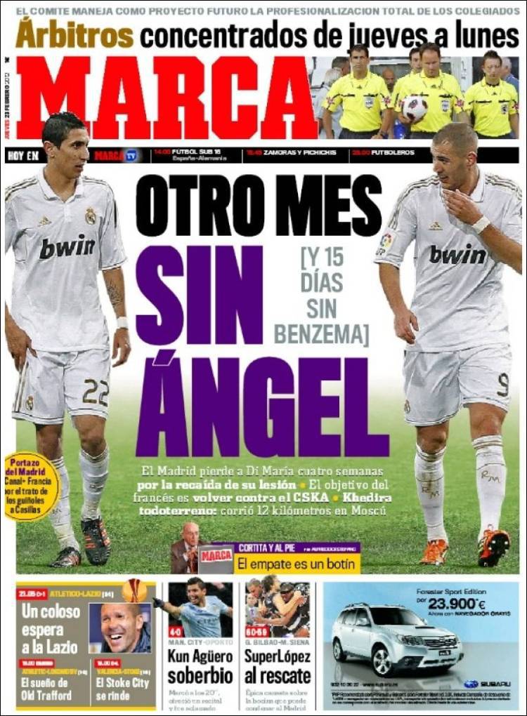 RASSEGNA STAMPA ESTERA MARCA REAL MADRID – Prima pagina del quotidiano Marca dedicata al Real Madrid che perde due pezzi importanti: Angel Di Maria per quattro settimane per un riacuttizarsi del suo precedente infortunio. Anche Benzema starà fuori 15 giorni: l’obiettivo del francese è rientrare per il ritorno degli ottavi di Champion’s League contro il CSKA.
