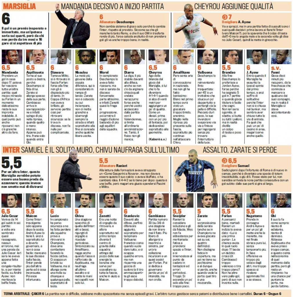 MARSIGLIA INTER VOTI PAGELLE GAZZETTA DELLO SPORT – La crisi dell‘Inter continua. In una partita povera di emozioni e con i nerazzurri più volte vicini al gol con Forlan, il Marsiglia al 93′ beffa gli uomini di Ranieri, complice anche un errore di Chivu e si aggiudica il primo tempo di una gara che finirà a San Siro. In casa, l’Inter sarà chiamata a disputare una grande gara. Sconfitta pesante ma che non compromette il passaggio dell’Inter. Ai nerazzurri sarà sufficcinete vincere 2-0 per continuare a sognare in Europa. Ma con una squadra così povera di idee non sarà sicuramente facile.