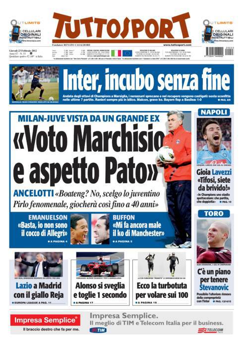 RASSEGNA STAMPA TUTTOSPORT MILAN JUVENTUS ANCELOTTI – Il quotidiano di Torino dedica la prima pagina al big match di sabato sera tra Milan e Juventus con un’intervista speciale a un grande ex, Carlo Ancelotti ora tecnico del Psg. L’ecx allenatore di entrambe le squadra consacra Claudio Marchisio tra i grandi della squadra bianconera e ammette di aspettare Alexander Pato in terra francese. Solo di riflesso l’Inter, beffata per un errore di Chivu al 93′ dal Marsiglia nella gara di andata degli ottavi di Champion’s League.
