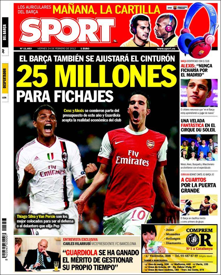 SPORT BARCELLONA – Sul quotidiano Sport si parla del Barcellona che vuole spendere 25 milioni di euro per un acquisto, Thiago Silva o Van Persie.