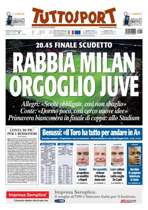 TUTTOSPORT MILAN JUVENTUS – Ovviamente Tuttosport non poteva non mettere in prima pagina il big match di questa sera tra Milan e Juventus.