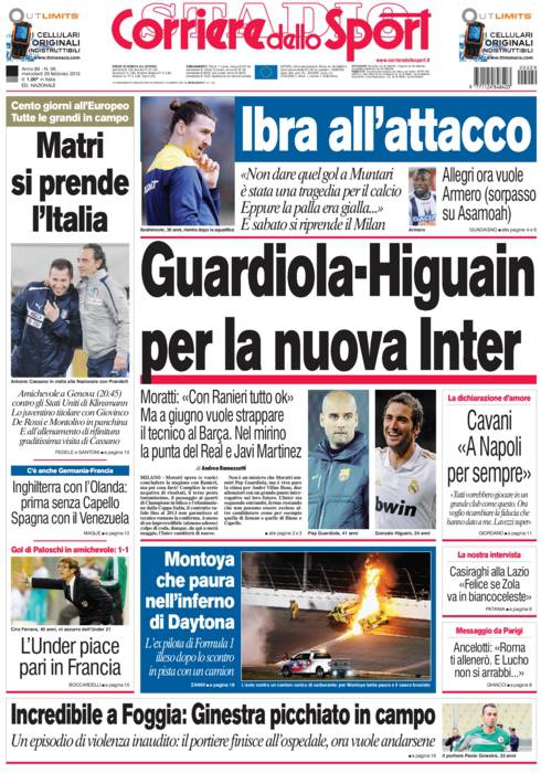 CORRIERE GUARDIOLA HIGUAIN INTER – Sul Corriere dello Sport si parla della nuova Inter che punterà su Guardiola tecnico e Higuain attaccante.