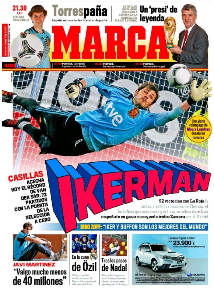 MARCA CASILLAS – Sul quotidiano Marca tributo a Iker Casillas, portiere del Real Madrid e della Spagna che oggi andrà a caccia di un altro record.