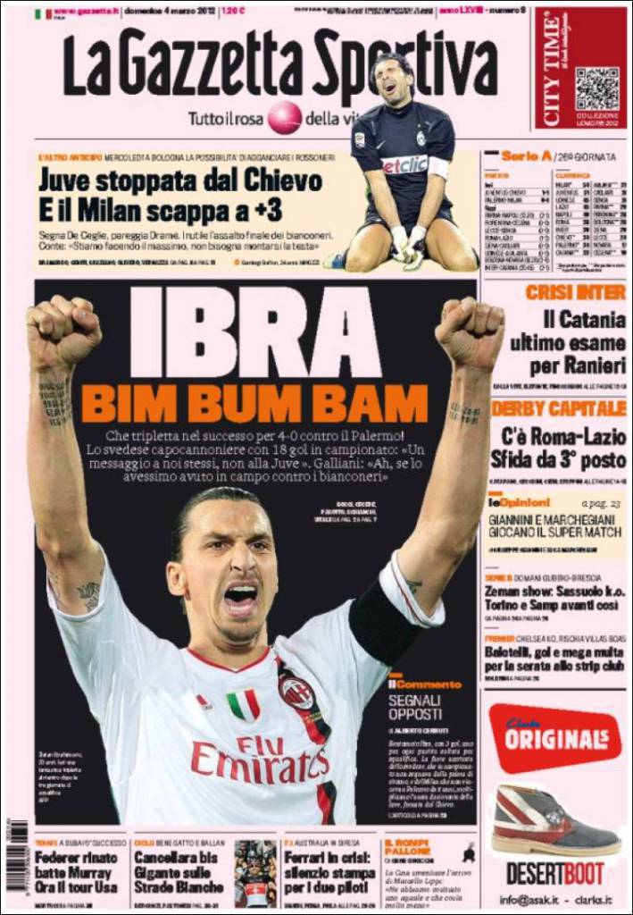 GAZZETTA DELLO SPORT IBRA BIM BUM BAM – Non ci sono più aggettivi per definire la magnificente prestazione di Zlatan Ibrahimovic che, al ritorno dalla squalifica, ha rifilato una fantastica tripletta al Palermo.