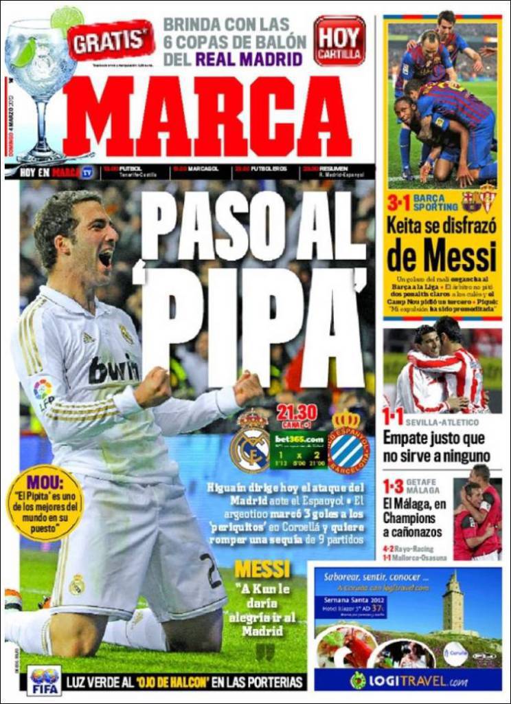MARCA PIPITA – Finalmente spazio dal primo minuto per Gonzalo Higuain, attaccante del Real Madrid che oggi scenderà in campo contro l’Espanyol. Da lui, Mourinho, si attende una grande prestazione.