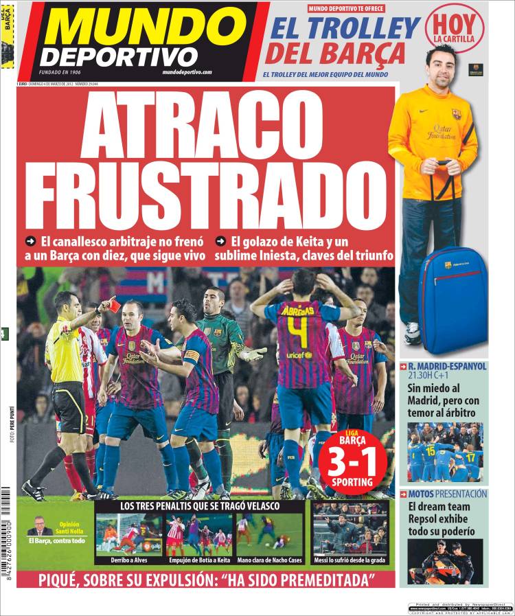 MUNDO DEPORTIVO TENTATIVO DI RAPINA – Tante polemiche per la vittoria del Barcellona che ieri, dopo una partita davvero combattuta e piena di episodi dubbi, è riuscita nei minuti conclusivi della partita a risolvere la pratica Sporting. El Mundo Deportivo parla addirittura di un tentativo di rapina.