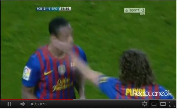 VIDEO BARCELLONA SPORTING GIJON – Durante la sfida fra il Barcellona e lo Sporting Gijon de La Liga, conclusasi con il risultato di 3 a 1 in favore dei campioni in carica, va registrata anche una splendida rete di Keita, centrocampista di origini maliani, tra l’altro, obiettivo di mercato del Milan. Ma la cosa che vogliamo farvi notate non è tanto la rete del centrocampista suddetto quanto il modo di congratularsi con lo stesso da parte del capitano degli azulgrana, Carles Puyol. Lo storico centrale di difesa del Barcellona ha infatti deciso di esaltare il compagno di squadra così…