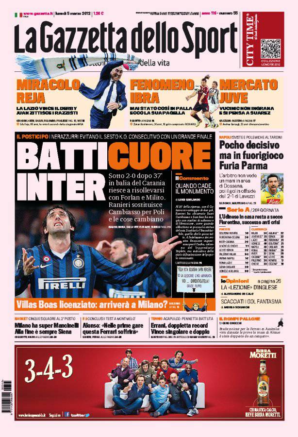 GAZZETTA INTER – Sulla Gazzetta dello Sport si parla dell’Inter che in svantaggio di due reti contro il Catania riesce a pareggiare.