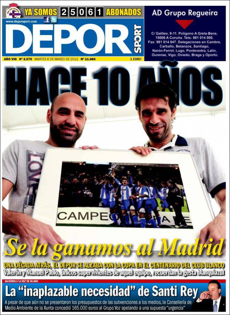 DEPORSPORT 10 ANNI FA MADRID – Amarcord per il quotidiano spagnolo Deporsport che ricorda insieme a due colonne del club, Manuel Pablo e Valeròn, la bella vittoria ottenuta 10 anni fa in Copa de Rey, in finale contro il Real Madrid.