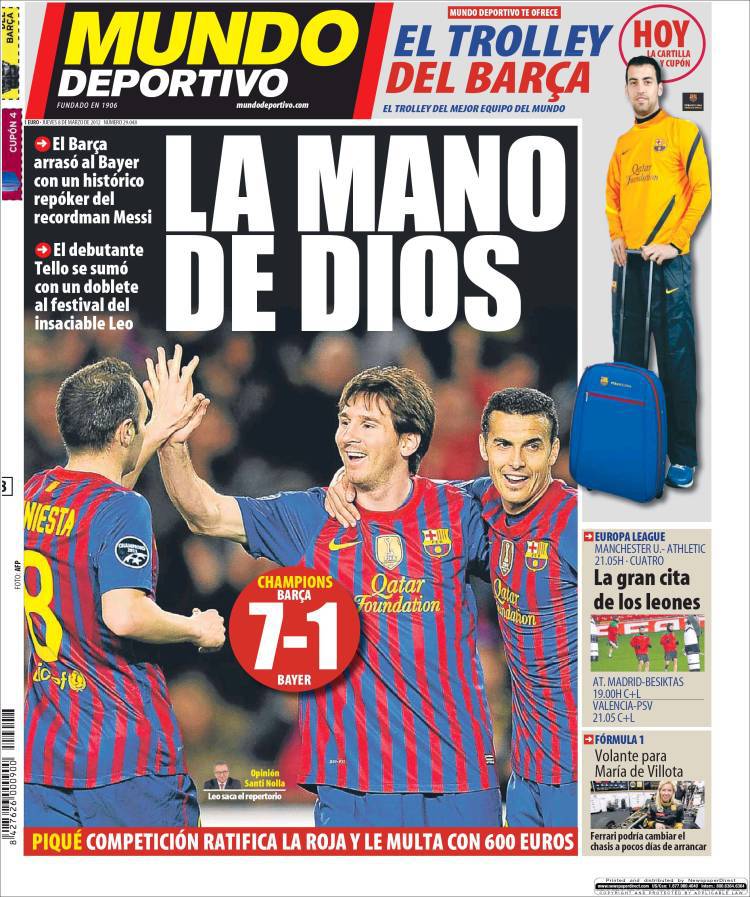 MUNDO DEPORTIVO MESSI – Stesso elogio a Messi da parte del quotidiano Mundo Deportivo. Il Barcellona strapazza il Bayer sette a uno.