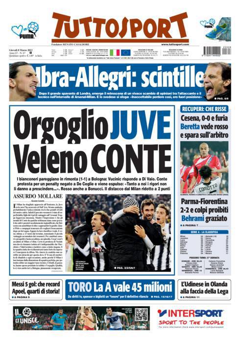 TUTTOSPORT JUVENTUS – La Juventus pareggia uno a uno a Bologna e Conte è furioso per un presunto rigore non dato.
