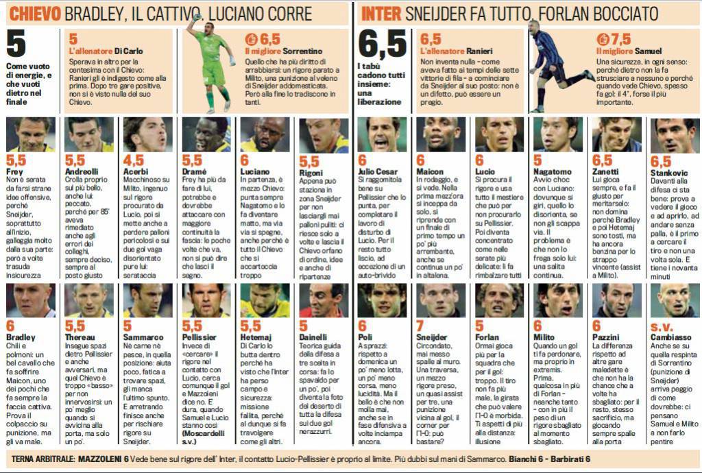 CHIEVO INTER VOTI PAGELLE GAZZETTA – L’Inter ritrova la vittoria contro il Chievo e vince due a zero al Bentegodi al termine di un match giocato bene dai nerazzurri che nel primo tempo sbagliano un rigore con Milito. Nella ripresa l’Inter prova a vincere ma il Chievo cerca di agire in contropiede. Finalmente arrivano i gol prima con Samuel e poi con Milito. Migliore in campo il difensore argentino, un vero muro che ha fermato ogni azione dei clivensi. Voti e pagelle della Gazzetta dello Sport.
