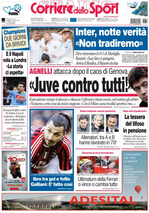 CORRIERE DELLO SPORT JUVE CONTRO TUTTI – E’ una Juve infuriata quella che ha descritto ieri in conferenza stampa il presidente della Juventus Andrea Agnelli. I bianconeri, secondo quanto detto dal presidente e riportato dal Corriere dello Sport, dovranno lottare da soli contro tutti.