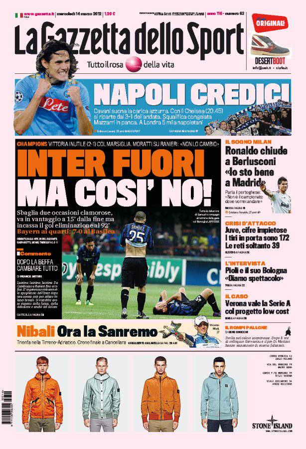 GAZZETTA INTER – Sulla Gazzetta dello Sport si parla dell’Inter che viene eliminata dal Marsiglia negli ottavi di finale di Champions League.