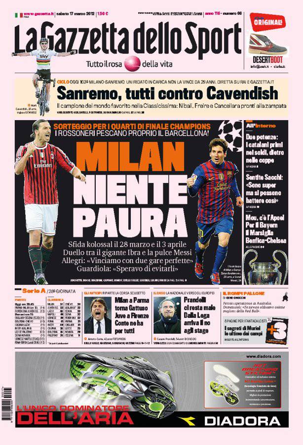 GAZZETTA MILAN – Sulla Gazzetta dello Sport si parla del Milan che in Champions League nei quarti di finale affronterà il Barcellona.