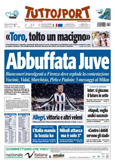 TUTTOSPORT ABBUFFATA JUVE – Tuttosport, nell’edizione di stamani, celebra la vittoria della Juventus in trasferta contro la Fiorentina per 5 reti a zero.