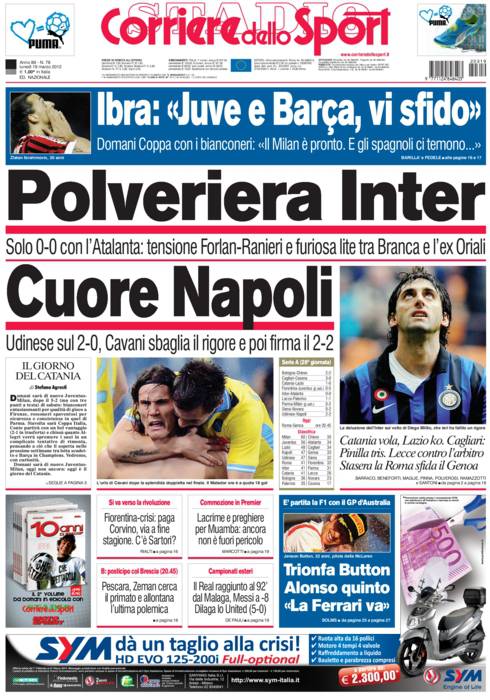 CORRIERE INTER – Anche il Corriere dello Sport parla del momento nero dell’Inter che pareggia in casa contro l’Atalanta, Milito sbaglia l’ennesimo rigore e Forlan si rifiuta di entrare.