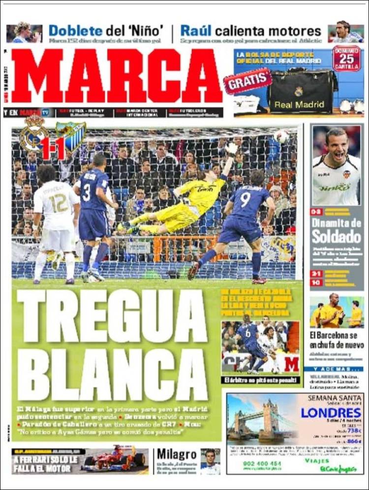 MARCA REAL MADRID – Sul quotidiano Marca si parla del Real Madrid che pareggia uno a uno contro il Malaga.