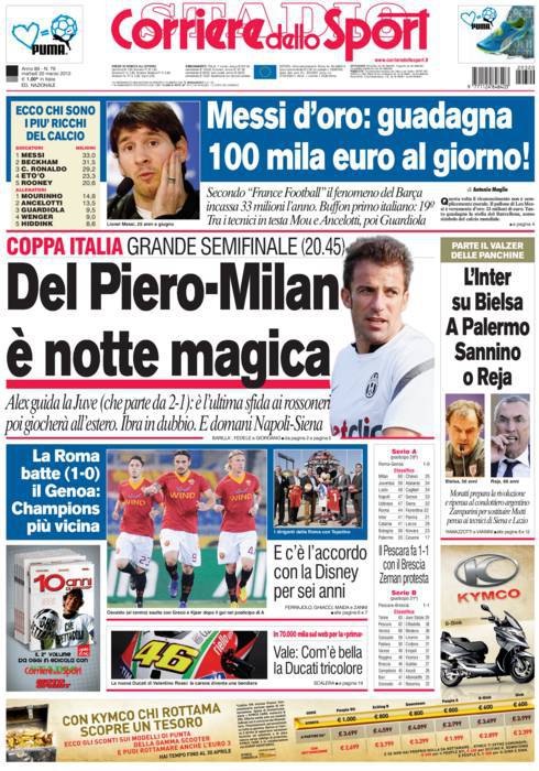 Corriere dello Sport: Del Piero-Milan è notte magica 20/03/2012 di admin CORRIERE DEL PIERO MILAN – Anche il Corriere parla del match di questa sera tra Juventus-Milan, semifinale di ritorno di Coppa Italia. La redazione di Calciomercatonews.com