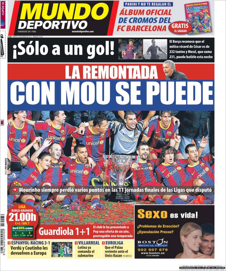 MUNDO DEPORTIVO BARCELLONA – I giornali catalani credono alla rimonta in campionato visto che Mourinho ha sempre perso punti nelle ultime 11 giornate.