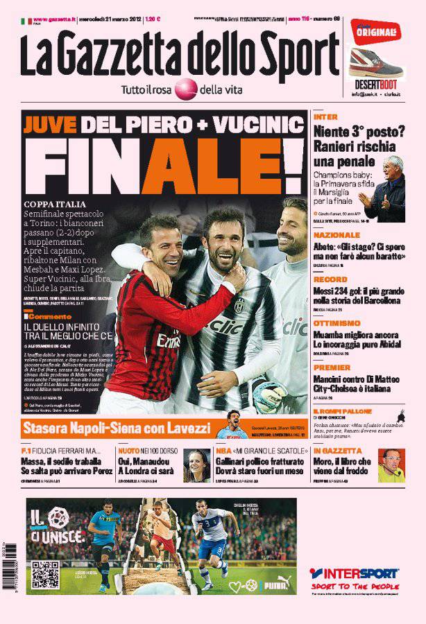 Gazzetta dello Sport: FINALE 21/03/2012 di admin GAZZETTA JUVENTUS MILAN – La Juventus pareggia due a due in casa contro il Milan e approda in finale di Coppa Italia. La redazione di Calciomercatonews.com